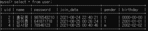 INSERT INTO user VALUES (default, '김사람', '78946123', default, 'm', '2002-02-02'); #데이터 추가